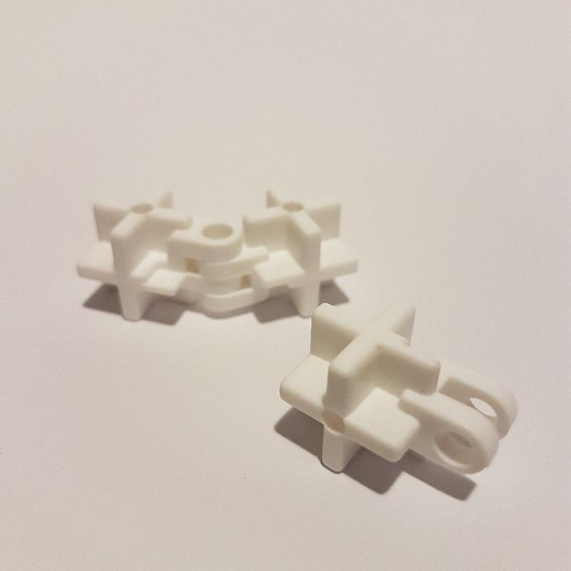 Pomocí 2 ks dílů konstrukčních spojek kloub a 1 ks čepu lze sestavit funkční spojku, otočnou o 1 - 180°. Využitelné pro jakékoliv otevírání konstrukcí na modelech, sestavovaných ze stavebnice SEVA.
